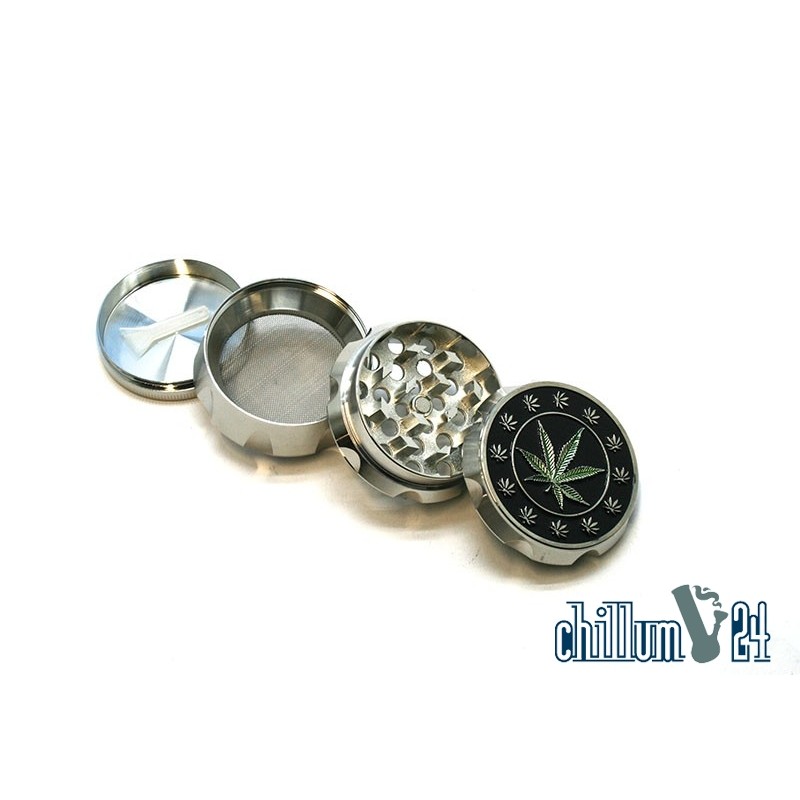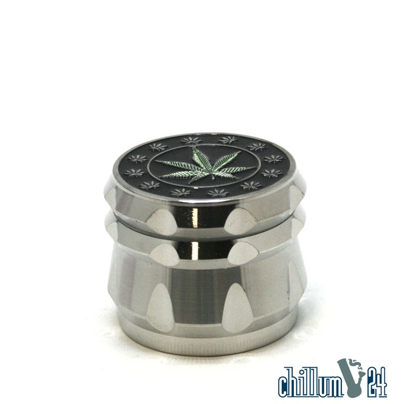 mit Griffkerben, in edlem Silvermetal-Gehäuse mit grünem Hanfblatt auf dem Deckel - Ø ca. 55 mm