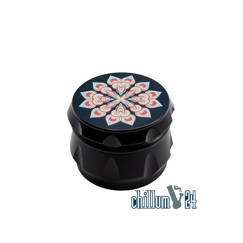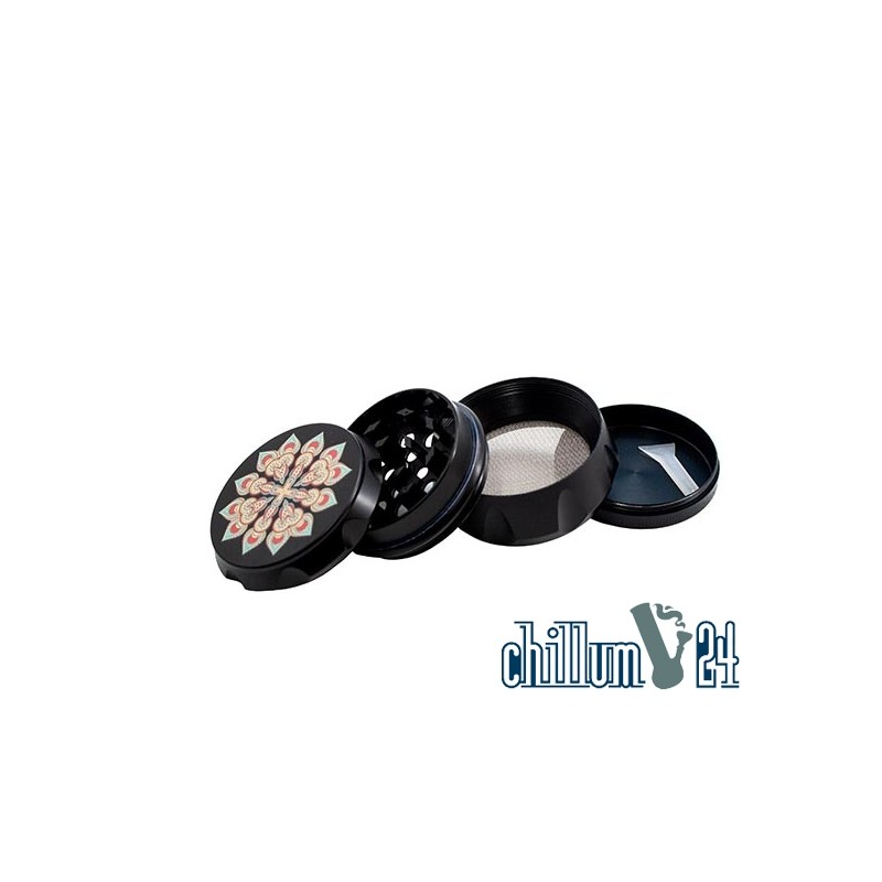 Dieser 4-teilige Aluminium Grinder aus der Mandala Serie ist mit Magnethalterung im Deckel, Sieb & Pollenfach, inkl. Pollenschaber ausgestattet.