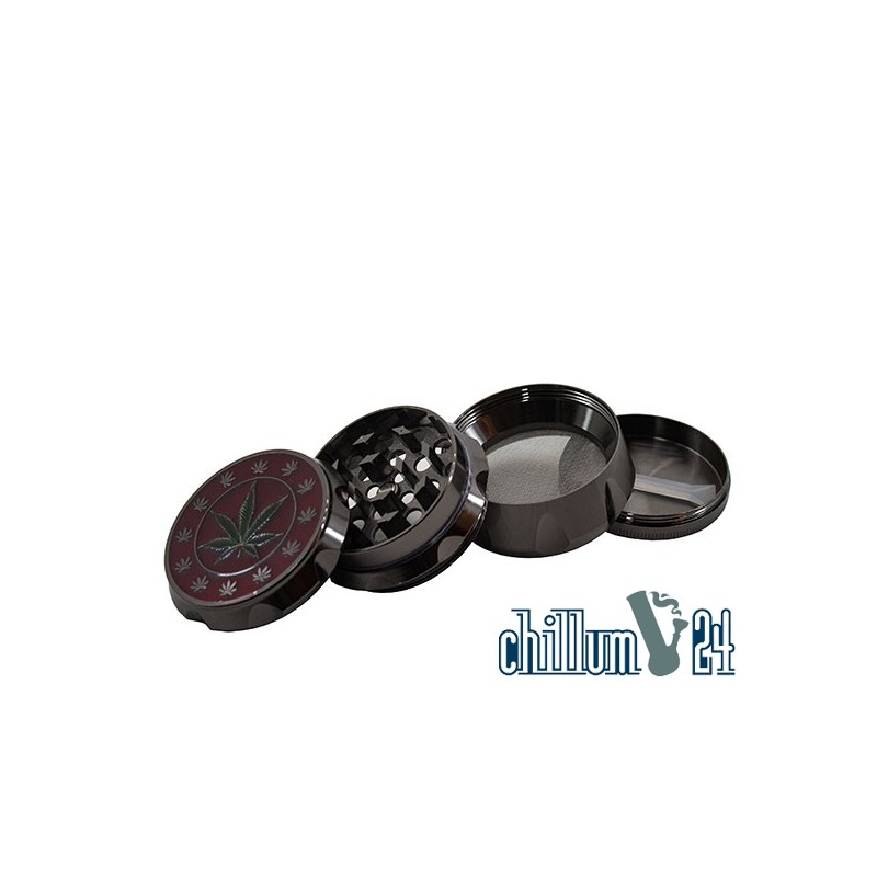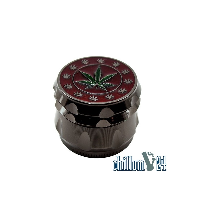 mit Griffkerben, in edlem Gunmetal-Gehäuse mit grünem Hanfblatt vor rotem Hintergrund auf dem Deckel - Ø ca. 55 mm