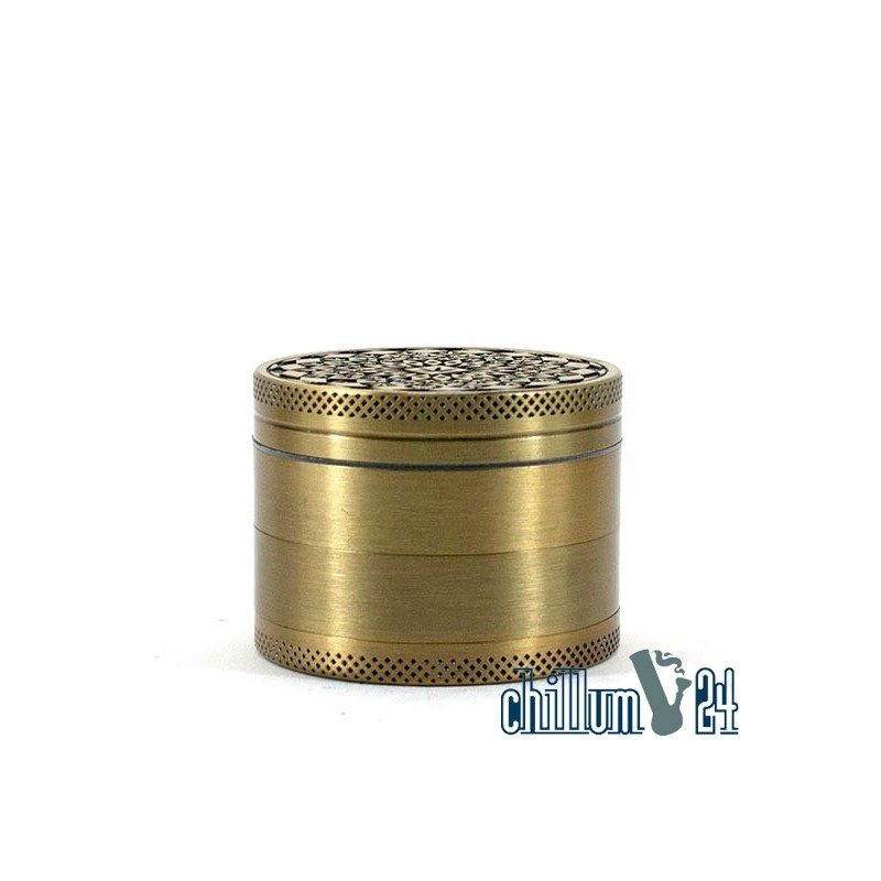 Dieser schöne Metallgrinder ist 4-teilig und hat unter dem 2-teiligen Mahlwerk noch ein Sieb- und ein Pollenfach.