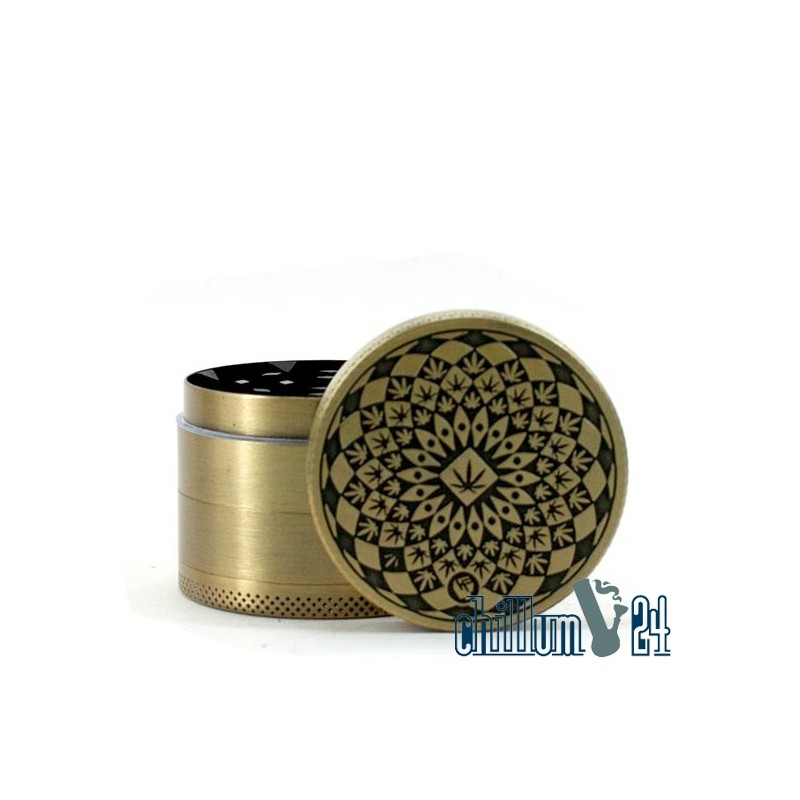 Ein Mandala mit Hanfblättern schmückt den Deckel der goldfarbenen Kräutermühle.