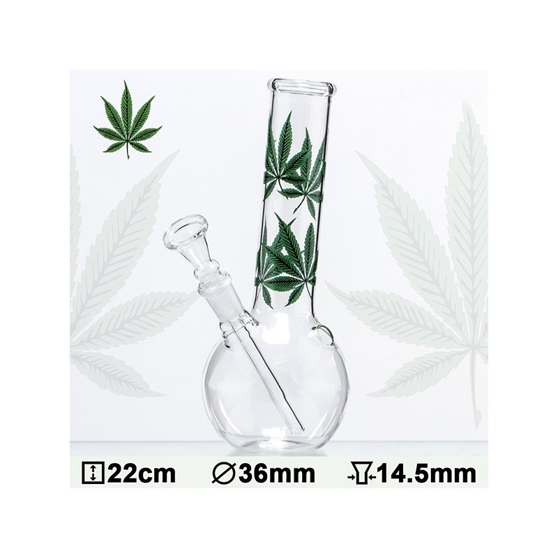 Diese Glasbong ist bedruckt mit mehreren grünen Hanfblättern auf der Außsenseite