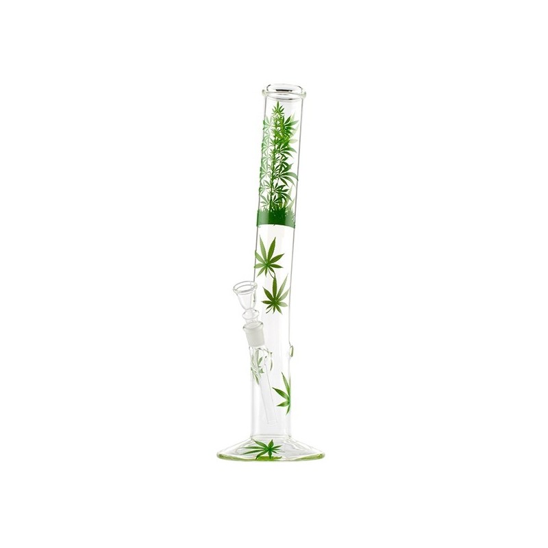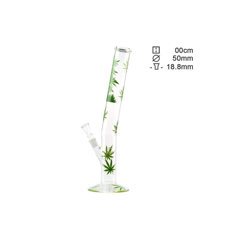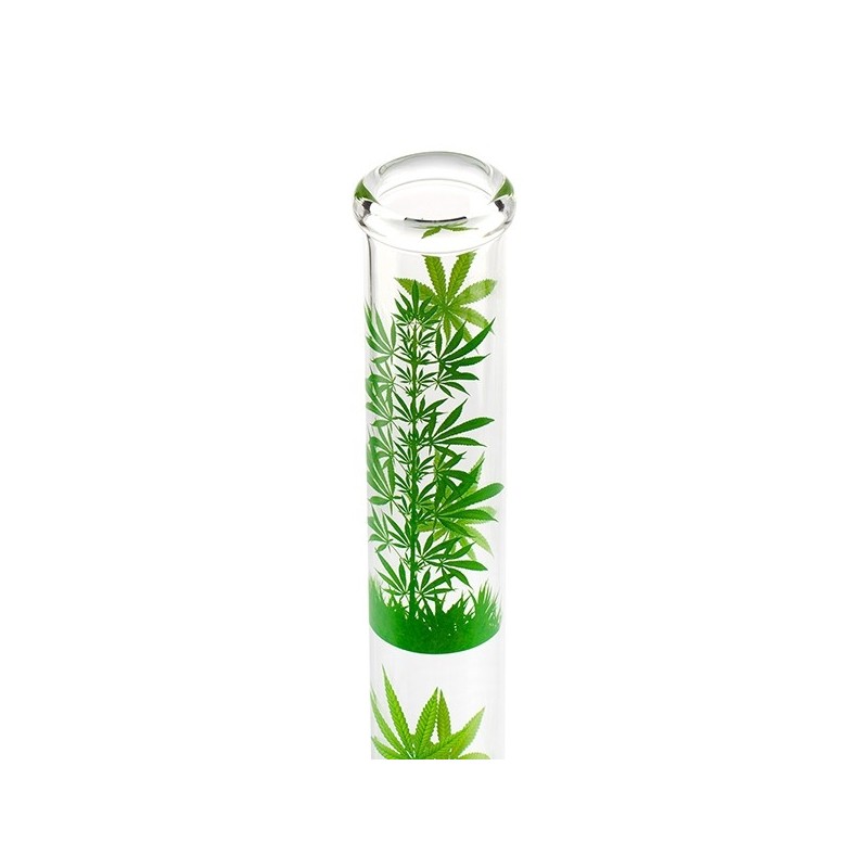 Diese leicht gebogene Glasbong ist von außen mit grünen Hanfblättern bedruckt.