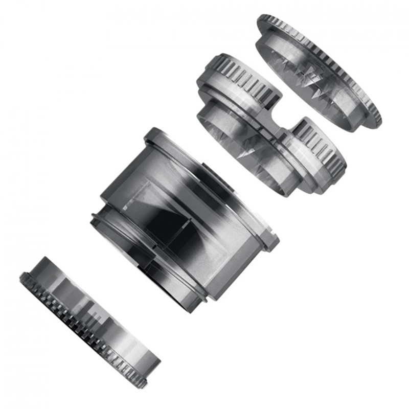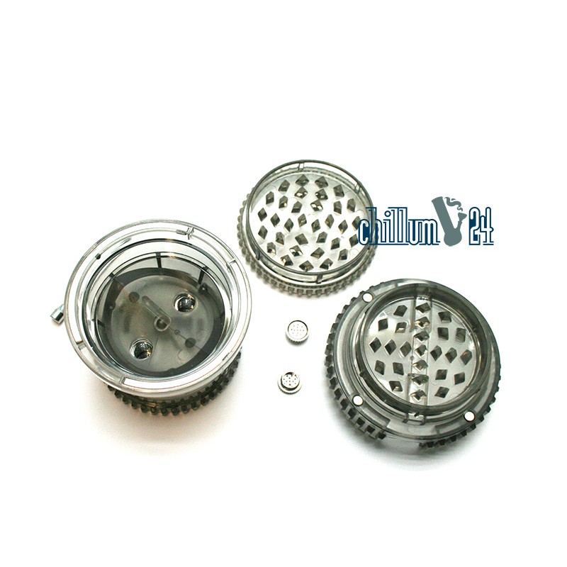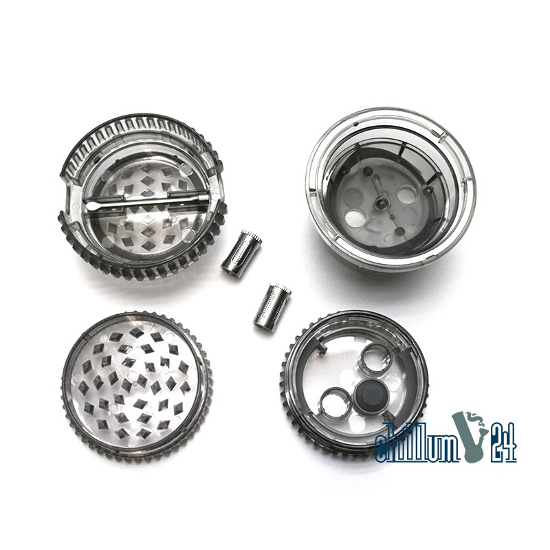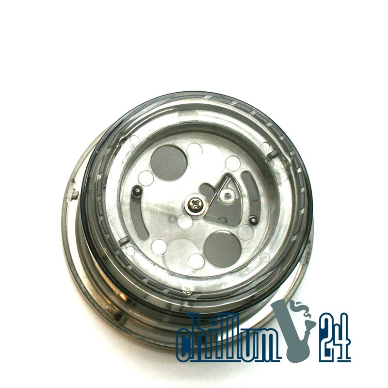 Dieser Grinder besteht aus 4 Teilen. Die beiden oberen Teile sind der eigentliche Grinder, und dank seiner riffeligen Kante