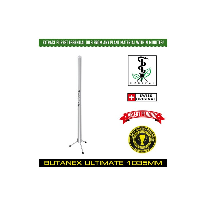 1035mm- Einfach die besten Extraktoren und der schönste Weg Pflanzenabfälle in Gold zu verwandeln! Die Butanex Extraktoren sind Ihre Erste Wahl wenn es um die Extraktion von essentiellen Ölen aus Schnittabfällen geht, weil Sie mit Butanex mit weniger Aufwand mehr extrahieren können. Die Butanex Extraktoren sind die einzigen Extraktoren die eine Entleerungseinheit mit schleppmittelverteilender Funktion verwenden, um Ihren Ertrag, die Effizienz und die Benutzerfreundlichkeit zu maximieren. Zusätzlich kombinieren die Butanex Extraktoren mit dem eloxierten Al2O3 Kristal Überzug die Vorteile eines metallischen Extraktors mit der Reinheit eines Glassextraktors und der Leichtigkeit von Aluminium. Die Butanex Extraktoren sind ein schweizer Original und werden gemäss den höchsten schweizer Ansprüchen an Qualität, aus hochwertigsten Materialien gefertigt. Butanex Extraktoren sind einfach im Gebrauch, sehr einfach in der Wartung, und halten ein Leben lang! Für wen ist der Butanex Extraktor Pro geeignet: Wenn Sie einen qualitativ hochwertigen Extraktor möchten der Ihnen für lange Zeit hervorragende Dienste leistet, dann sind die Butanex Extraktoren für Sie das richtige! Der Butanex Extraktor Pro ist die beste Wahl wenn Sie mittlere Mengen Pflanzenmaterial extrahieren möchten, Sie die Butanex Extraktoren testen möchten oder Sie sich noch vom Verfahren überzeugen wollen. Der Butanex Pro ist ideal für die effiziente Extraktion von mittleren Mengen Pflanzenmaterial. Die Füllmenge des Extraktionsrohrs Butanex Pro beträgt etwa 80 Gramm. Die Butanex Extraktoren haben einen unerreichten Wirkungsgrad und extrahieren essentielle Öle in unter 5 Minuten.