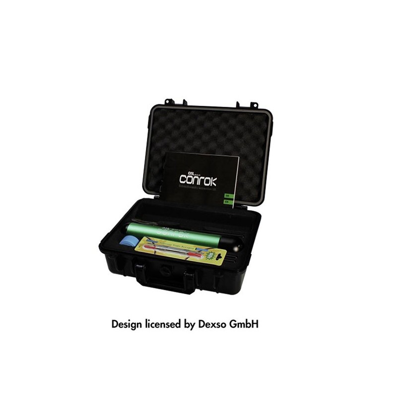 Das Conrok Extraktions-Kit von Oil Black Leaf enthält alles, was man zur Extraktion von wertvollen Ölen aus Kräutern und Pflanzenresten benötigt: Den Conrok Extraktor inkl. Entleerungseinheit, Dichtungsring und Sieb, einen Öl-Weiterverarbeitungsteller aus Silikon, ein Dabbing-Tool aus Edelstahl mit Silikonkappen und eine kleine Silikondose zur Aufbewahrung der gewonnenen, kostbaren Substanzen. Transportsicher und unauffällig verpackt in einem wasserdichten Koffer.