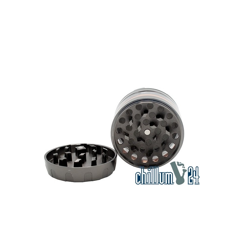 Das anthrazit-farbene Gehäuse hat ein Sichtfenster, wodurch man den Inhalt des Grinders immer im Blick hat.