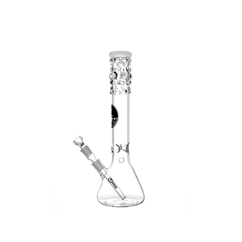 Eine Bong mit Eis-Einstichen und Bowl in Form eines Erlenmeierkolbens, verziertem Mundstück und Schlitzdiffusor-Chillum.