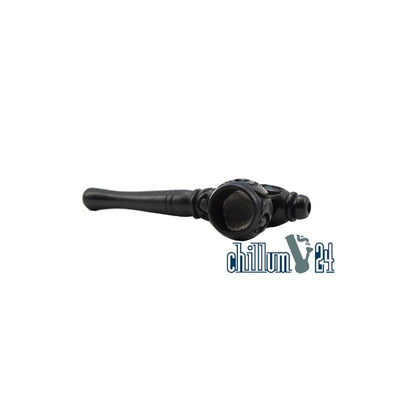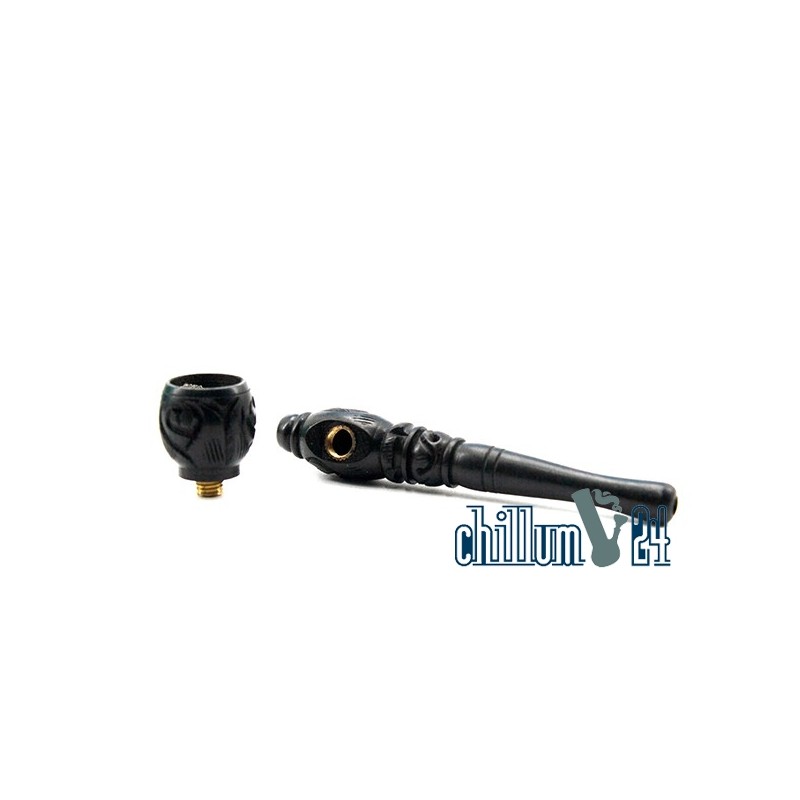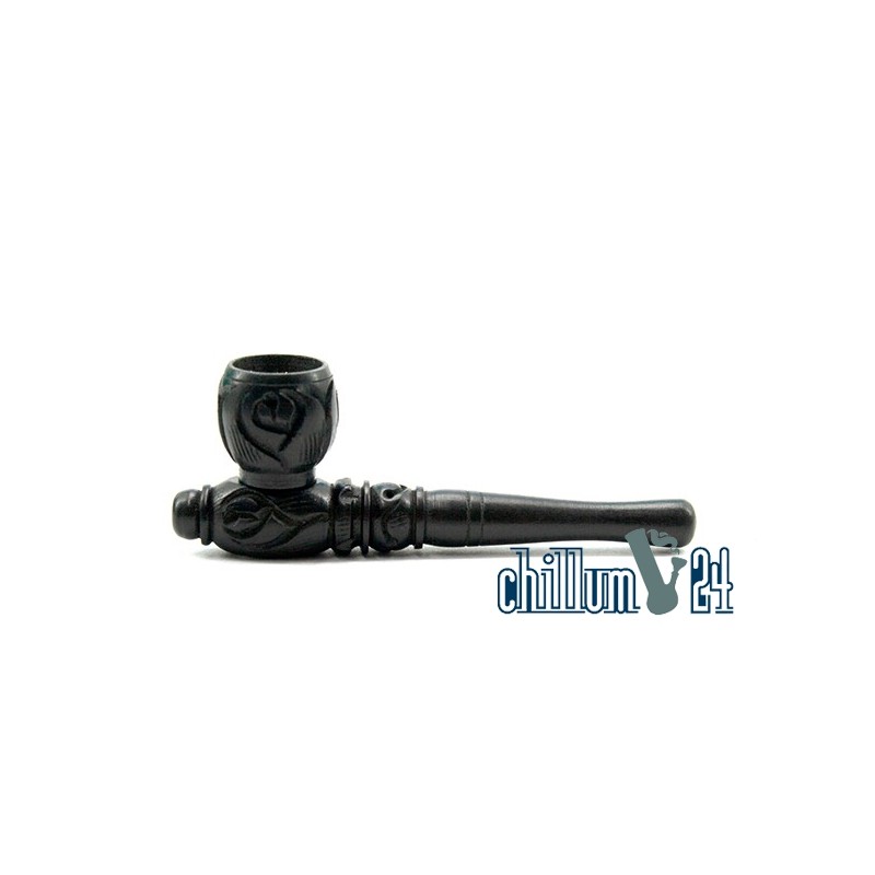 Diese schwarze verzierte Holzpfeife liegt Dank ihrer Form sehr gut in der Hand.