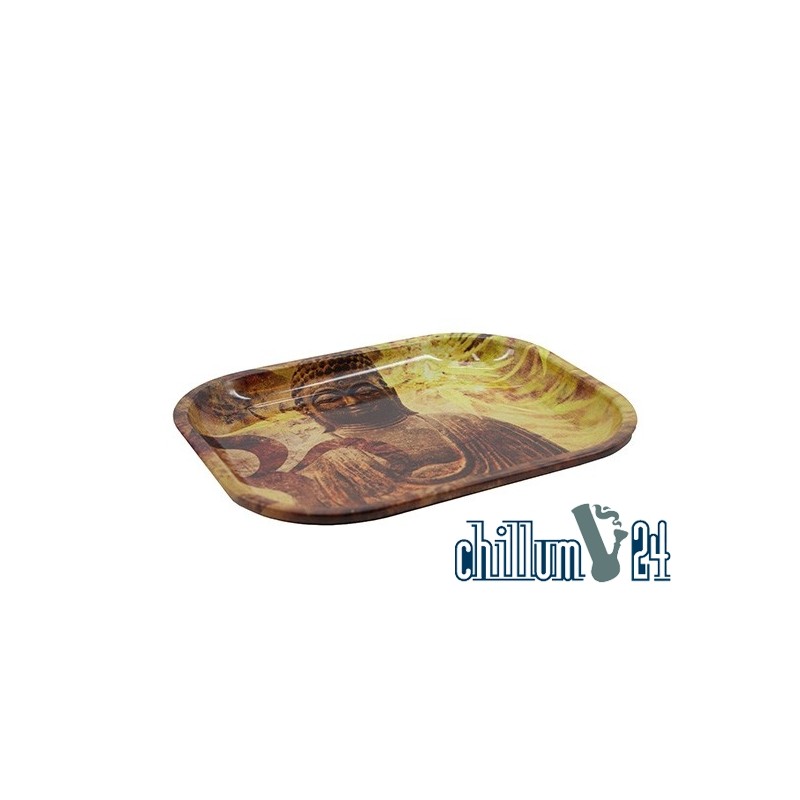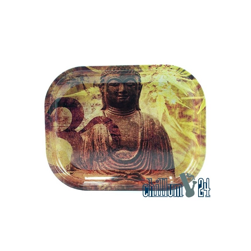 Dieses schöne & bunt bedruckte Drehtablett von V-Syndicate zeigt eine Buddha-Figur und ein OM-Zeichen.