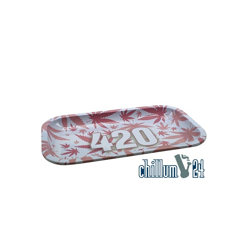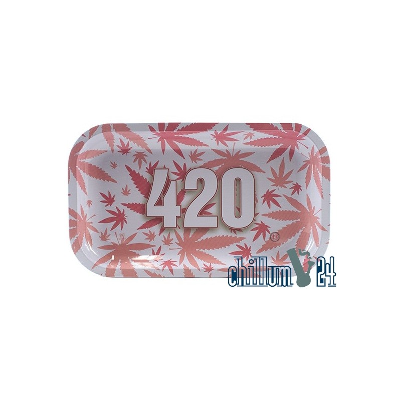 Dieses schöne & bunt bedruckte Drehtablett von V-Syndicate zeigt "420" in weiß auf pinkfarbenem Blättergrund.