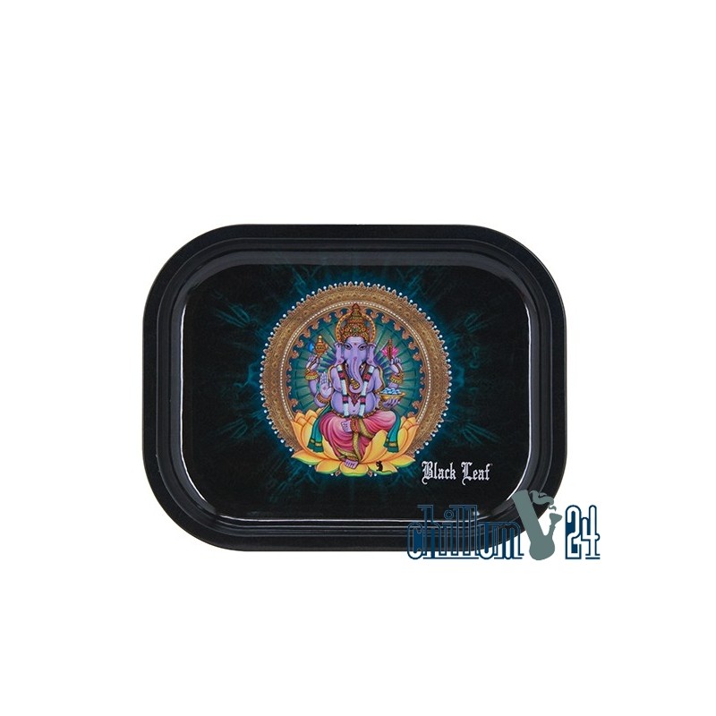 Eine bunte Ganesha schmückt das schwarze Metall-Tray und ein kleines, weißes Black Leaf-Logo